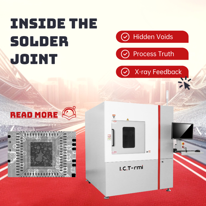 Inline lida com altos volumes de aprovação/reprovação e medições básicas; offline fornece diagnósticos mais profundos. Contexto: Existem compromissos entre velocidade e resolução. Princípio: Os sistemas inline integram-se em linhas para obter dados em tempo real, mas não possuem as visualizações inclinadas/oblíquas e a maior ampliação das unidades off-line necessárias para o reconhecimento de padrões de causa raiz. Exemplo: A produção usa inline para monitoramento de tendências e alertas; a engenharia extrai amostras para estações off-line como o I.C.T-7900 para mapeamento detalhado de vazios e estudos de correlação.
